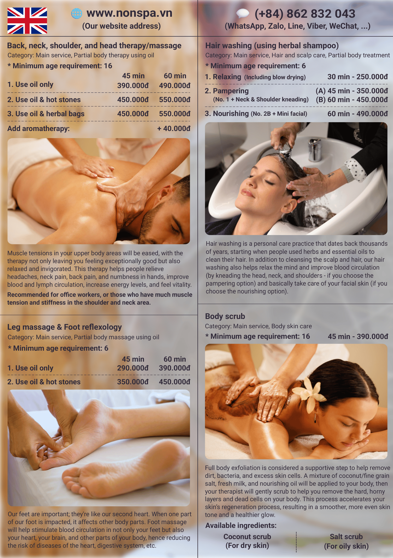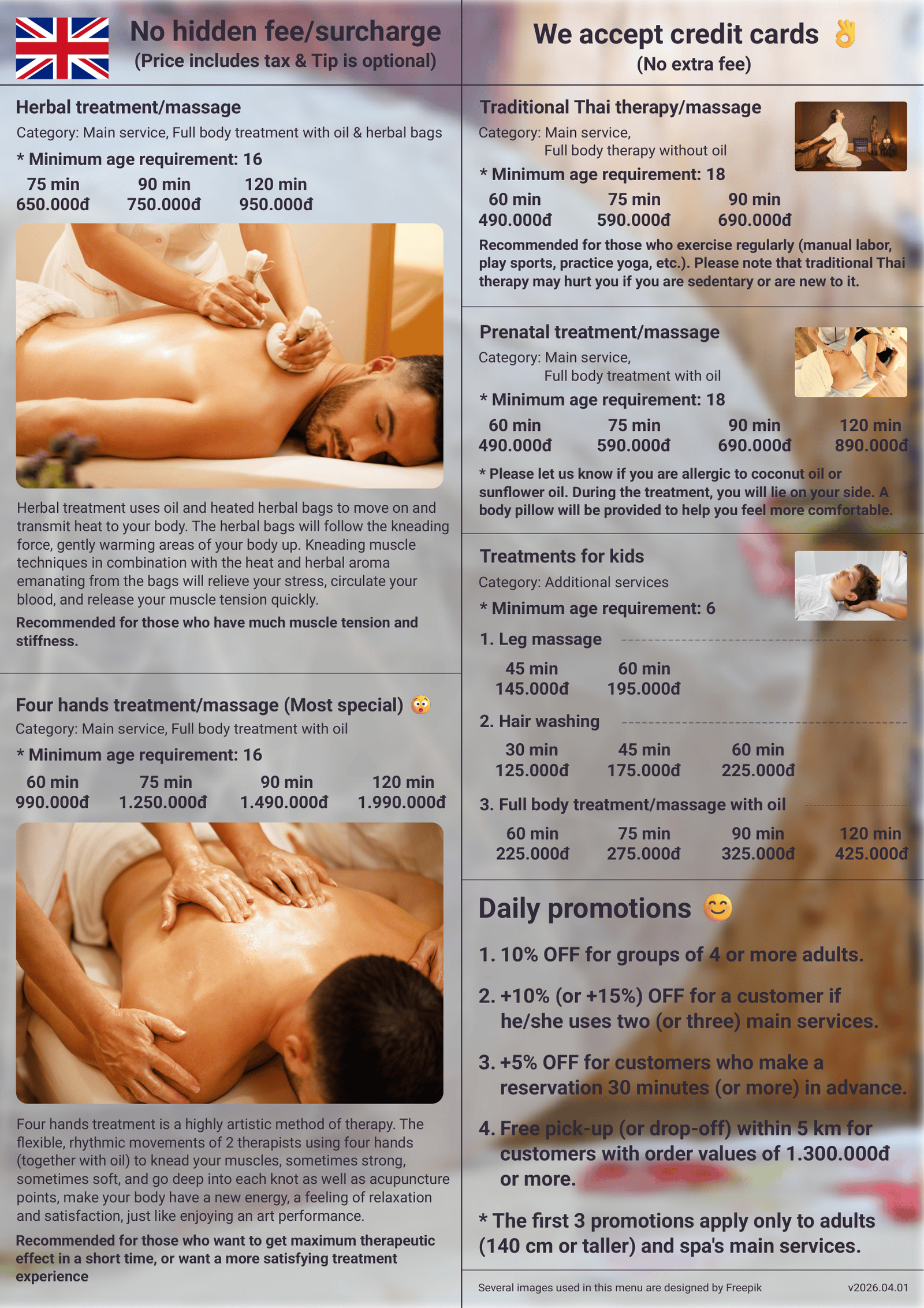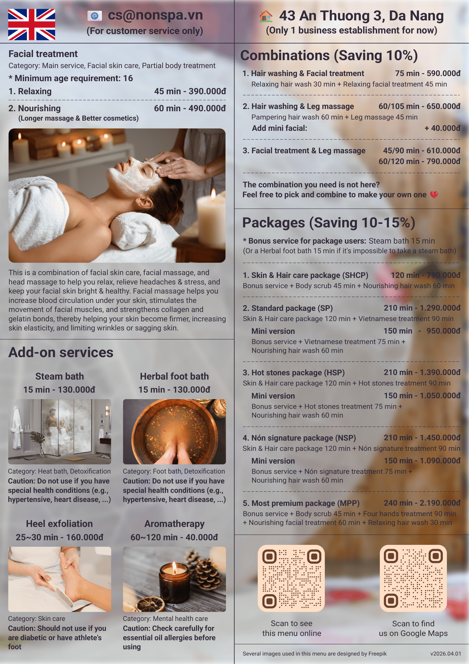Note: Due to space limitations on the physical menu, the service list and other information will not be as comprehensive as on the website.